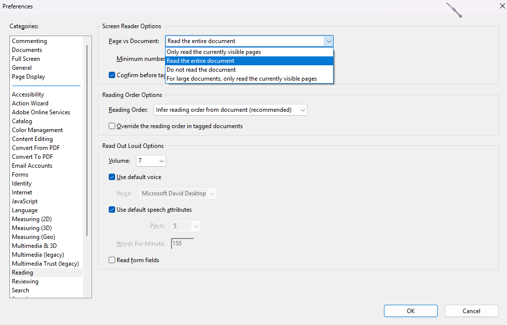 This is the default setting because it provides the most practical and user-friendly experience for reading documents. It ensures that the document follows a logical, page-by-page structure, allowing users to navigate efficiently using keyboard shortcuts or navigation commands, depending on the screen reader they are using. Maintaining this standard navigation behavior supports accessibility best practices and allows all users—especially those relying on assistive technologies—to move through the document smoothly and predictably. - Read the entire document :
