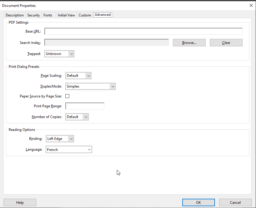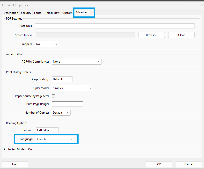 Solution : Balisez le PDF dans le panneau Balises pour garantir qu’il est structuré pour l’accessibilité et marquez-le comme un « Tagged PDF ». - Langue non définie :