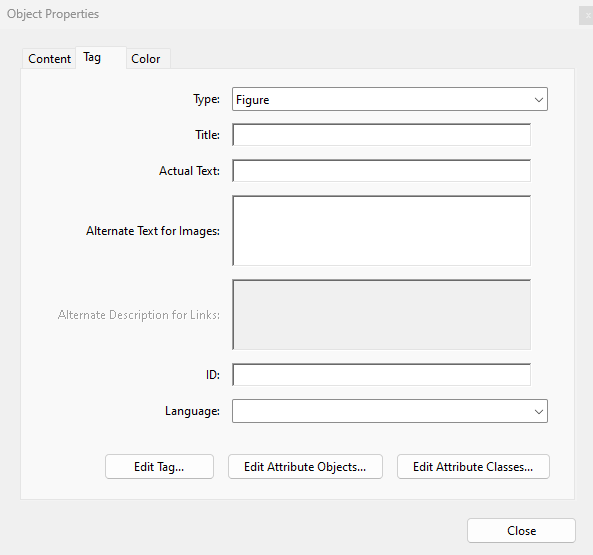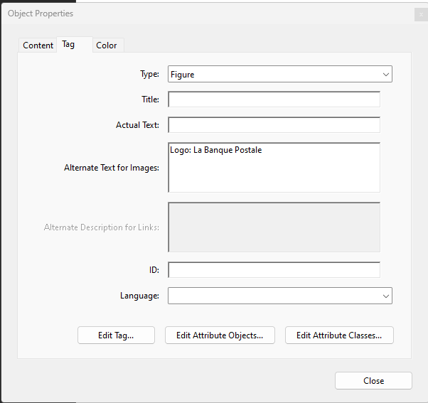 Solution : Ajustez l’ordre de tabulation dans le panneau Balises ou via l’outil TouchUp Reading Order pour garantir un flux de lecture correct. - Texte alternatif manquant pour les liens et les figures :
