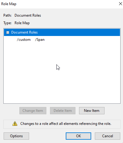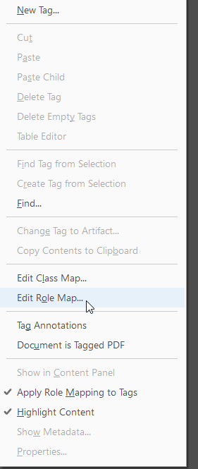 - Dans le panneau des balises dans Acrobat Pro, cliquez sur l'icône Options en haut à gauche et sélectionnez "Modifier le mappage des rôles".