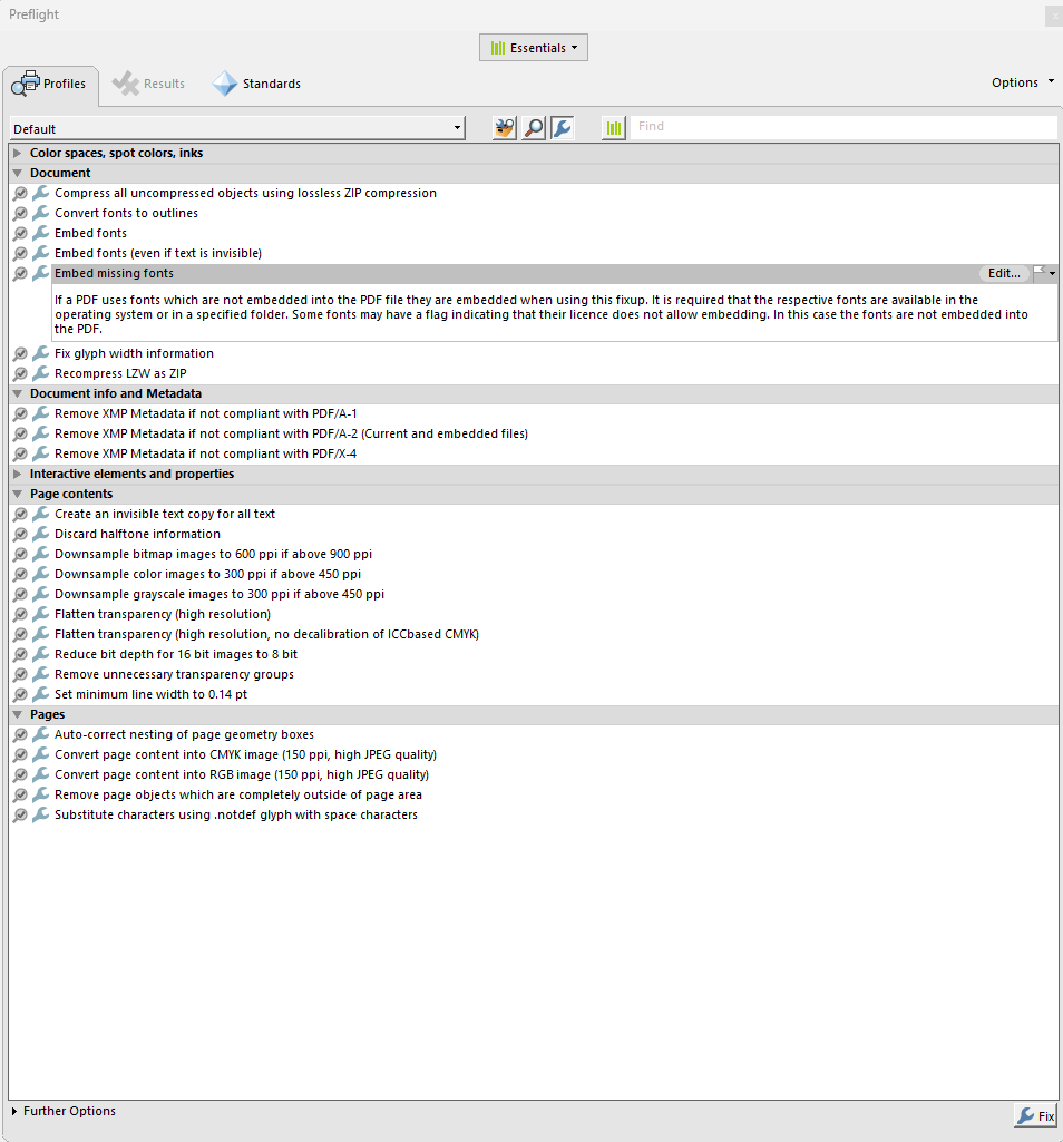- Alternativement, dans Prévol, vous pouvez exécuter une correction qui intègre automatiquement les polices manquantes.