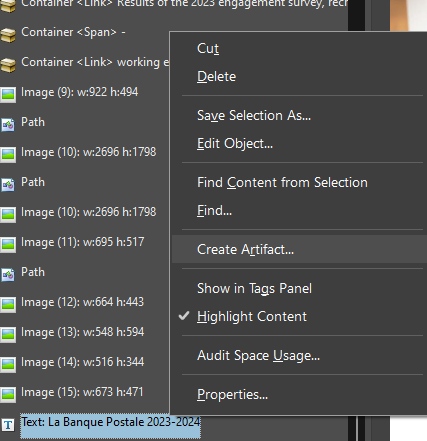 - Les éléments non balisés peuvent être trouvés dans le Panneau de contenu et être marqués manuellement comme des artefacts.