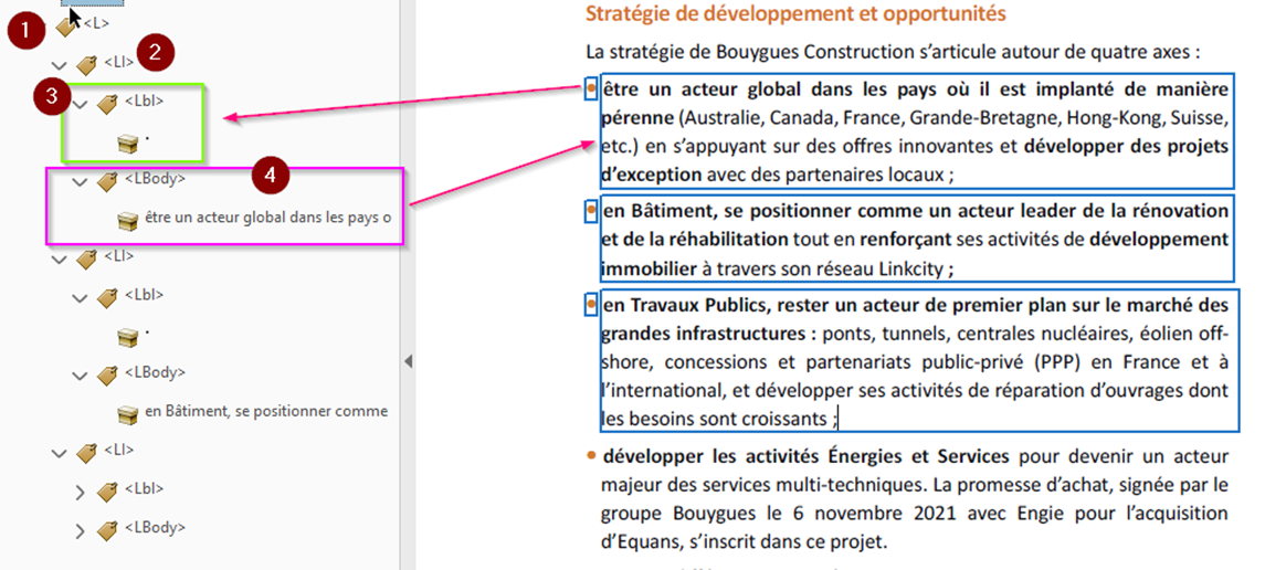 Pour corriger ce problème, ouvrez le panneau des balises dans Adobe Acrobat Pro, faites un clic droit sur la balise <LI>, et ajoutez les éléments manquants. Assurez-vous que la balise <Lbl> contient uniquement la puce ou le numéro, tandis que la balise <LBody> inclut le contenu textuel associé.