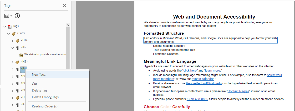 Appliquez les balises appropriées au contenu identifié en faisant un clic droit et en sélectionnant le type de balise correct, comme <P> pour les paragraphes.