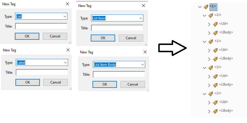 - Glisser-déposer le contenu directement dans la hiérarchie correcte (par exemple, faire glisser du texte dans <LBody> sous <LI>). Cela est plus rapide que de créer des balises à partir de zéro.